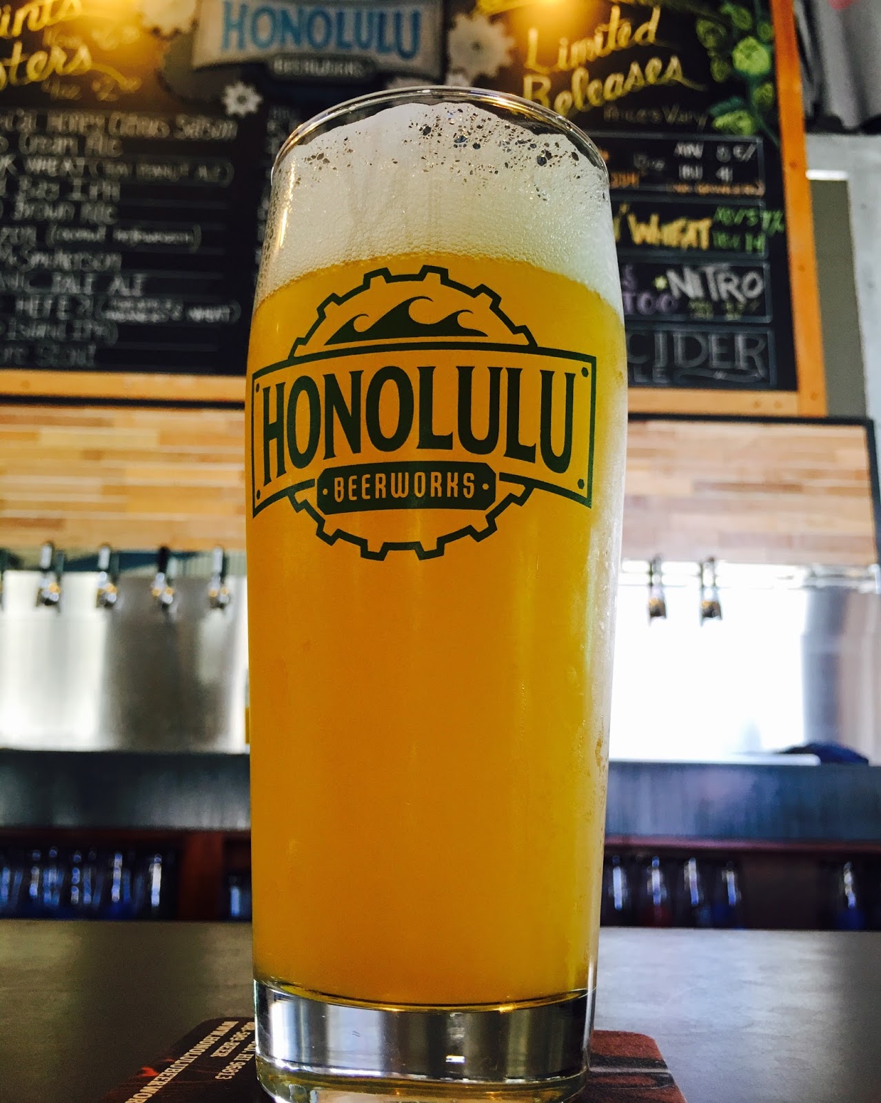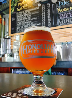 We had the Pālua DIPA (Aroma of resiny floral hops, slight murky amber color, strong sweet hop flavor, deceptively strong) and Mango Man Wheat (Cloudy golden color, dry tart mango overall, aroma of citrus, dry aftertaste). It was fun to try two starkly different yet refreshing beers on a hot day.
